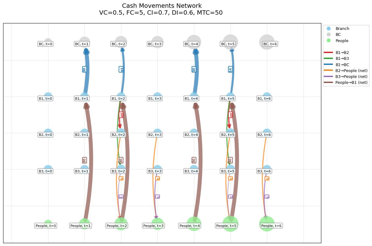 This project explores the problem of minimizing cash-transfer costs between bank branches over some time by deciding when and how much to move using trucks and central-bank facilities.